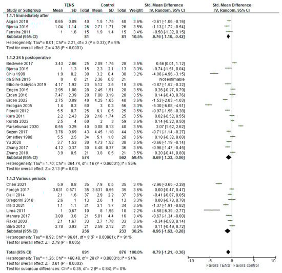 The forest plot in Figure 2 illustrates the pain intensity at rest measured immediately after surgery, 24 h post-surgery, and at various intervals. The overall model effect favors TENS over the control, indicating a standardized mean difference (SMD) on a 0-10 scale with a 95% CI of −0.79 [−1.21, −0.36], with a p-value less than 0.00001. However, it is important to note that the model shows substantial heterogeneity (I2 = 94%). The TENS group comprises 891 patients, while the control group consists of 876 patients. One study [72] was excluded from the meta-analysis due to the absence of a reported sample standard deviation.