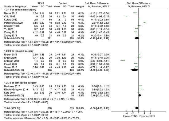 In terms of subgroup analysis, the model shows no significant difference between the TENS and control groups. The ‘For abdominal surgery’ subgroup yielded an SMD of −0.49 [−1.41, 0.42], p-value = 0.29; the ‘For thoracic surgery’ subgroup yielded an SMD of −1.30 [−2.86, 0.27], p-value = 0.10; and the “For orthopedic surgery” subgroup yielded an SMD of 0.46 [−0.03, 0.95], p-value = 0.06.