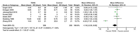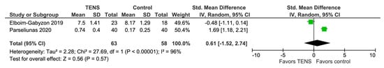 The model shows no significant difference between TENS and control (MD with a 95% CI: −1.16 [−2.35, 0.02], p-value = 0.05; I2 = 94%) (Figure 9). The result is sensitive to the exclusion of any of these three studies: Erdogan 2005, Solak 2007, or Stubbing 1998, in which case, the model favors TENS.