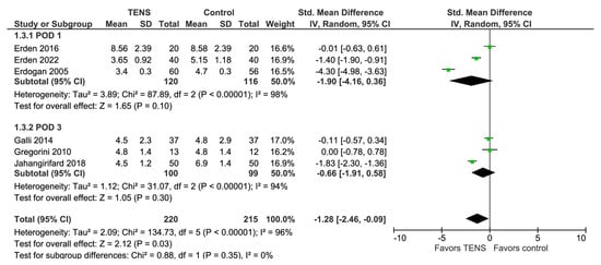The overall effect of the model favors the TENS group over the control group (SMD with a 95% CI: −1.28 [−2.46, −0.09], p-value = 0.03) (Figure 5). This result is statistically significant but sensitive to the exclusion of some studies [45,46,61]. Subgroup analysis reveals no significant difference between the groups. It is important to note that one study [57] did not provide the time of measurements, and as a result, we included it in the POD 3 subgroup.