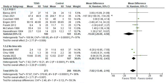 The overall effect of the model favors TENS over control (MD with a 95% CI: −7.82 [−13.48, −2.16], p-value < 0.00001) (Figure 6). However, this result is sensitive to the exclusion of a study by Chen 2021 [55]. Broken down, on POD1, the use of TENS decreased morphine use by 15.64 mg [−26.69, −4.58], p-value = 0.006, I2 = 97%. In the “no time” subgroup, morphine use was decreased by 6.28 mg (−6.28 [−10.12, −2.43], p-value = 0.001, I2 = 90%) in the TENS group.