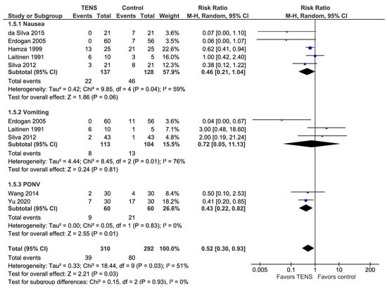 The overall effect of the model favors the TENS group over the control group (the risk ratio (RR) with a 95% CI: 0.52 [0.30, 0.93], p-value = 0.03; I2 = 51%) (Figure 7). It should be noted that the studies primarily reported the incidences of PONV on postoperative day 1 (POD 1) and postoperative day 2 (POD 2), but several studies did not explicitly report the time of measurement [13,35,46].