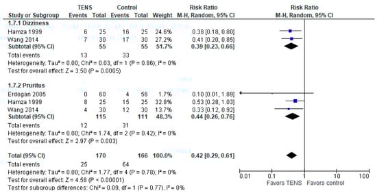 The overall effect of the model favors TENS over control (RR with a 95% CI: 0.42 [0.29, 0.61], p-value < 0.00001, I2 = 0%) (Figure 8). The model supports TENS over control in both subgroups: ‘dizziness’ and ‘pruritus’. Specifically, for dizziness, the RR for the TENS group is 0.39 [0.23, 0.66], p-value = 0.0005, I2 = 0%, 2 studies, 110 patients. For pruritus, the RR for the TENS group is 0.44 [0.26, 0.76], p-value = 0.003, I2 = 0%, 3 studies, 226 patients.