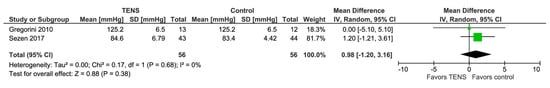 The model indicates no significant difference between TENS and control (MD with a 95% CI: 0.98 [−1.20, 3.16], p-value = 0.38; I2 = 0%) (Figure 10). Sezen et al., 2017 [50] reported the blood pressure values for postoperative day 1 (POD 1), and Gregorini et al., 2010 [58] reported these for postoperative day 3 (POD 3).