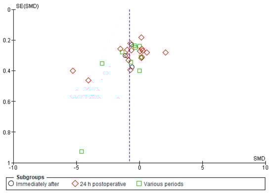 Subgroup analysis further reinforces the superiority of TENS over the control across all three subgroups (‘immediately after surgery’, ’24 h after surgery’, and ‘various periods’), although with considerable heterogeneity for the latter two (I2 = 96% and I2 = 91%, respectively). In the ‘immediately after surgery’ subgroup, the SMD with a 95% CI is −0.76 [−1.10, −0.42], with a highly significant p-value < 0.0001, I2 = 9%. In the primary (24 h postoperative) subgroup, the SMD with a 95% CI is −0.69 [−1.33, −0.06], with a p-value of 0.03, I2 = 96%. The third subgroup, covering varied measurement times, such as ‘after TENS’ [13], ’12 h postoperative’ [59], ‘postoperative day 3’ [58], ‘postoperative day 7’ [34], ‘4 weeks postoperative’ [56], and instances with no provided information [39,55,57,60], shows a significant SMD with a 95% CI of −0.96 [−1.63, −0.28], with a p-value of 0.005, I2 = 91%. These results indicate statistically significant improvements in pain intensity for the TENS group in all the measured periods.