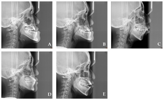 Figure 1): Group 1 (early adolescence, 10–13 years), Group 2 (middle adolescence, 14–17 years), Group 3 (late adolescence, 18–21 years), Group 4 (early adulthood, 22–30 years), and Group 5 (middle adulthood, 31–50 years). Additionally, skeletal relationships were classified into three classes: Class I (ANB angle = 0° to 4°), Class II (ANB angle > 4°), and Class III (ANB angle < 0°).