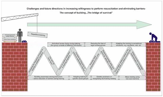 In order to create a modifiable point of reference for future research regarding the search for factors influencing the initiation of resuscitation by bystanders and thus reducing barriers causing lack of action, it is worth making an attempt to present a new concept. The concept of continuous construction of “the bridge of survival” (Figure 1). Its essence would be to build a bridge allowing a person witnessing SCA to move to the point where he or she is able to undertake effective resuscitation based on prior recognition of cardiac arrest. This bridge concept is built of bricks that are the result of scientific research and recommendations [7,8,9,10,11,12,13,16,17,18,19,20,21,22,23,24,33,34,35,36,37,38,39]. These bricks may have a different quality and may be replaced or rebuilt as new variables appear over time. This means a completely new approach, different from the previous ones. They assume the need for constant verification and modification guided by reality. This approach is to be largely driven not only by new scientific achievements but, above all, by the variability of the human factor and the reality in which the victim and bystanders live and function. This first outline of the concept is based on a literature review, the results of the present study, and the authors’ previous research. However, it is very important to realize that this is not a target presentation. The concept itself, by its nature, should generate more questions than answers and become the basis for researchers’ investigations and continuous work on the reorganization of many factors. Regardless of the fact that it is largely based on a literature review, in relation to the current study and its results, it may constitute a proposal for adaptation among first-year medical students in Poland during the pandemic period. As its important feature is the possibility of reconstruction, the final variant of the bridge should be based on further research on different populations of bystanders.