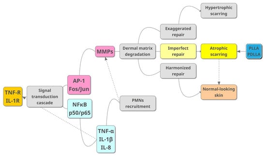 An illustration showing the current understanding of the pathophysiology of atrophic acne scarring and the role of poly-(lactic acid) to improve atrophic scars. Abbreviations: AP-1, activator protein 1; IL-1β, interleukin 1 beta; IL-1R, interleukin 1 receptor; IL-8, interleukin 8; MMP, matrix metalloproteinase; NF-κB, nuclear factor kappa-light-chain-enhancer of activated B cells; PDLLA, poly-(D,L-lactic acid); PLLA, poly-(L-lactic acid); PMN, polymorphonuclear neutrophil; TNF-α, tumor necrosis factor alpha; TNF-R, tumor necrosis factor receptor.