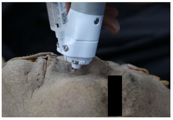 Demonstration of pre-clinical testing in an unfixed cadaver. The nozzle of the needle-free injector is positioned 5 mm from the facial skin surface.