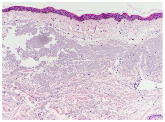 A histological examination of cadaver facial skin following a single injection using a novel needle-free injector, revealing a uniform distribution of poly-(lactic acid) particles in the dermis. These particles were primarily located in the upper- and mid-dermis, with a presence also in the lower dermis. The epidermal layer and blood vessels appear to be undisturbed. Hematoxylin and eosin stain (×100 magnification).