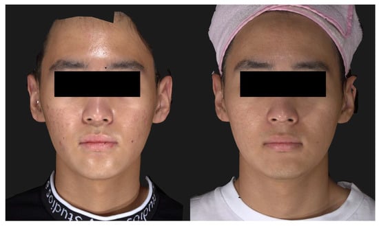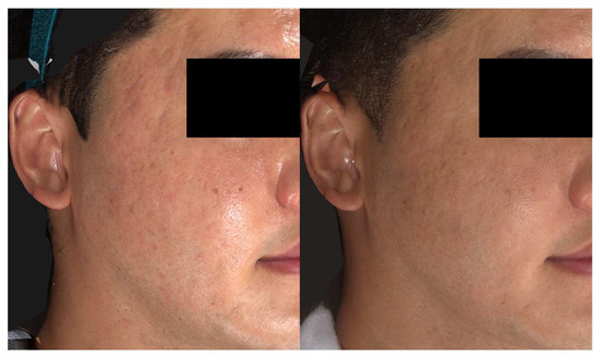 A notable improvement in atrophic scarring observed in Patient 1 (male, 17 years) after the injection of poly-(lactic acid) using a needle-free injector. Before (left) and two months after the single treatment session (right). Standardized clinical photos were taken with Vectra M3 (Canfield Scientific, Parsippany, NJ, USA).