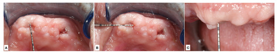MD diameter was measured at the point of the maximum MD width of the socket for both single-rooted and multi-rooted teeth. OV diameter was measured at the point of the maximum oral vestibule width of the socket or of each root (considering only the maximum value for the plurirooted teeth). SD was measured as the distance between the gingival margin and the socket bone at the point of its maximum depth (without forcing the probe). After training of the examiners (T.R. and G.R.), all the measurements were performed using a HuFriedy PCPUNC 15 probe (HuFriedy, Chicago, IL, USA) on the day of the surgery (D0), and after 3 (D3), 7 (D7), and 14 (D14) days from the surgery, memorizing the reference points for each patient to avoid possible measurements errors. An additional follow-up visit after 21 (D21) days was planned in case the socket was not completely healed after 21 days from the surgery.