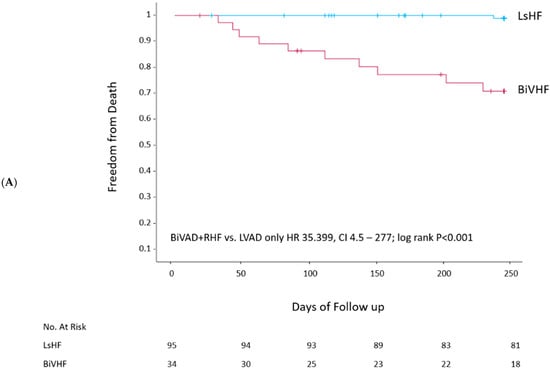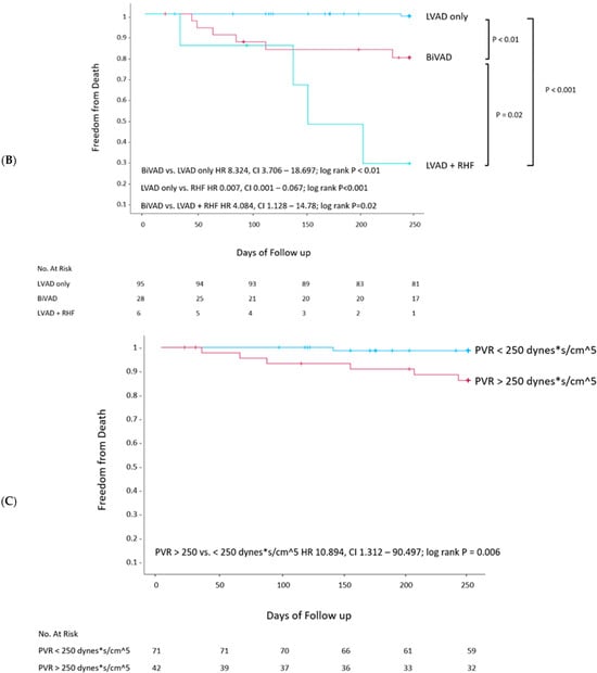 Statistical analysis was performed using SPSS Statistics 27 provided by IBM (Armonk, NY, USA). Continuous and normally distributed variables are expressed as mean ± standard deviation. Receiver operating characteristic (ROC) curves were used to determine cut-off values for outcome analysis. Kaplan–Meier analysis was performed for clinical outcomes using time to first event. The study population was divided into three subgroups: one included individuals with LVAD only who developed RHF postoperatively and required secondary RVAD support, another included LVAD patients without RHF, and the third included LVAD patients with RHF who received intraoperative immediate RVAD support. Subgroups were also defined based on PVR (≥250 dyn/s/cm5 and <250 dyn/s/cm5). Differences in time-to-event distributions were evaluated by means of the log-rank test. Hazard ratio (HR) values were calculated using Cox regression. Univariate analyses were performed first and all parameters with p < 0.1 were then included in the multivariate analysis. A p-value of <0.05 was considered statistically significant.