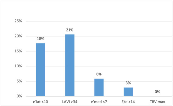 The percentage of patients presenting different diastolic dysfunction criteria on echocardiography. e′ lat, the mitral ring e′ velocity in tissue Doppler on lateral wall; LAVI, left atrial volume index; e′ med, the mitral ring e′ velocity in tissue doppler on intraventricular septum; TRV max, maximum tricuspid regurgitation velocity.