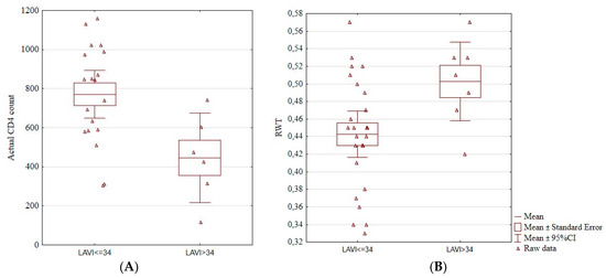 Boxplots showing a significant association between the enlarged left atrium and actual CD4+ cell count (A) and RWT (B). Actual CD4+, the number of CD4+ lymphocytes, LAVI, left atrium volume index, RTW, relative wall thickness, CI, confidence interval.