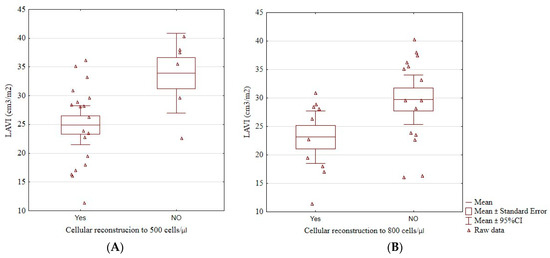 The boxplots of a significant relationship between cellular reconstruction above 500 cells/μL (A) and above 800 cells/μL (B) and LAVI. LAVI, left atrial volume index, cellular reconstruction—the reconstruction of the immune system above 500 or 800/μL CD4+ lymphocytes.