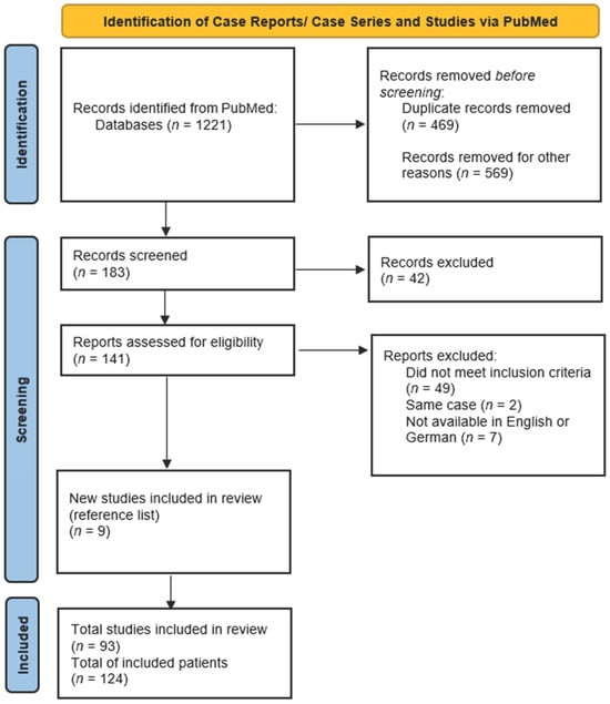 The search in PubMed yielded a total of 1221 publications. A screening of the titles identified 1038 irrelevant or double publications. A total of 183 articles were screened on the basis of the abstract; of these, 141 were classified as relevant and full-text reading was carried out. A screening of the reference list yielded a further nine publications. Forty-nine articles did not meet the inclusion criteria or provide relevant information and were therefore excluded. Two articles depicted the same case, so one was excluded [,]. Seven articles could not be included because the full text was not available in English or German [,,,,,,].
