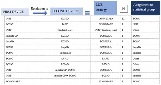 Data were extracted by the first author and independently checked for accuracy by the last author. Data extracted included authors, title, year of publication, patient demographics (age, sex), MCS strategy, vital signs before circulatory support (systolic/diastolic blood pressure or MAP, heart rate), respiratory failure, use of inotropes before MCS, performed angiography (LVEDP), cardiac arrest before MCS, new ECG abnormalities (ST elevation, ST depression and T wave inversion), new arrhythmias, LVEF (before MCS, on MCS and in follow-up), NTproBNP/BNP (baseline and follow-up), baseline lactate, presence of left ventricular outflow tract obstruction (LVOTO) (gradient) or mitral regurgitation (MR) (systolic anterior motion), trigger, TTS type (inverted or normal), RV involvement, time to weaning of inotropes under MCS, time on MCS and follow-up (last documented date after implantation, LV recovery and survival). Patients treated with more than one device were assigned to a device group for statistical analysis (see Figure 2). The assignment was based on the device to which the authors attributed therapy success. Thus, if MCS therapy was escalated to another device under which therapy success was achieved, the patient was assigned to the device group to which it was escalated.
