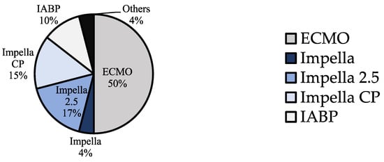 After assigning the patients with two or more devices to a device group (Figure 2), the patient collective was divided into four device groups: ECLS, Impella, IABP and Other (Figure 4). The ‘Other’ group included two cases where a TandemHeart was combined with IABP and Impella, as well as one case where central ECLS was established and two cases treated with a BiVAD [,,,,]. The Impella group was further subdivided according to the generation used: the Impella 2.5, which can increase cardiac output (CO) by about 2.5–3 L/min, was the most frequently used model, accounting for 47.7% of Impella cases. The Impella CP, which can relieve the left ventricle and support the circulation with a higher capacity of up to 4 L/min, was used in 40.9% of the cases. In 4% of the Impella cases, no exact model was named.