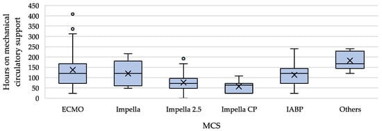 Comparison of mechanical circulatory support duration with median, IQR, outliers and mean (=x). For the number of cases evaluated per group, see Table 3.