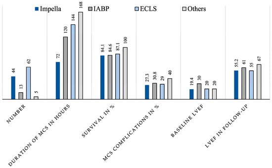 It should be emphasised that there was no significant difference in baseline LVEF across the various MCS groups. With a p value of 0.015, a significant result was found when comparing the median baseline LVEF values between the groups; however, a pairwise comparison showed that this significance existed only between IABP and the Impella as well as IABP and ECLS. The median values of baseline LVEF between the Impella and ECLS, however, did not differ significantly (p: 0.665).