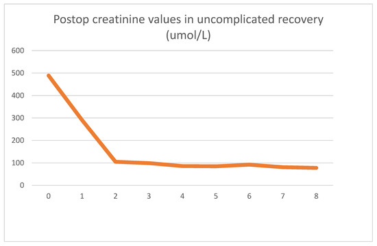 The patient received a cadaver graft, which was implanted in an atypical upside-down position with the ureter anastomosed to the small bowel conduit. The biopsy showed slight preservation damage to the tubules (ATN I). Graft filtration did not begin during implantation, and postoperative lab values were as shown Figure 3 and Figure 4.
