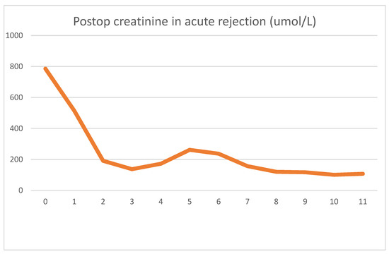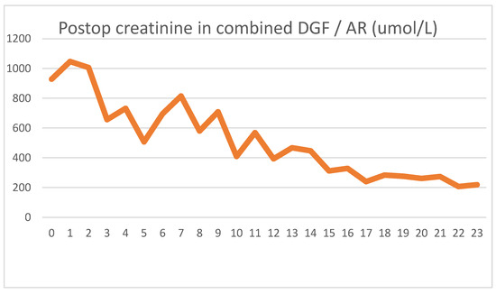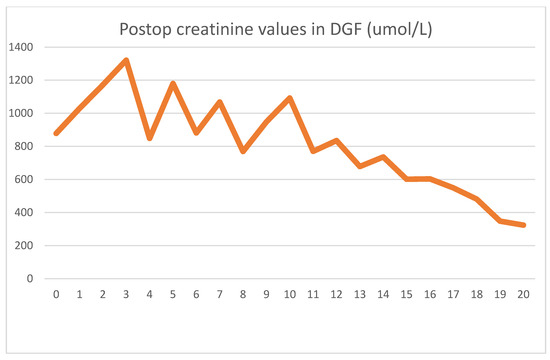 During emergent surgery, she was implanted with a DBD cadaver graft. The biopsy showed minor preservation damage to the tubules (ATN I). The graft had already started producing urine during implantation. Postoperative lab values were as follows Figure 5 and Figure 6.