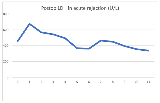 Daily LDH values first showing a typical spike. Acute rejection on day 4 is associated with a decrease in LDH.