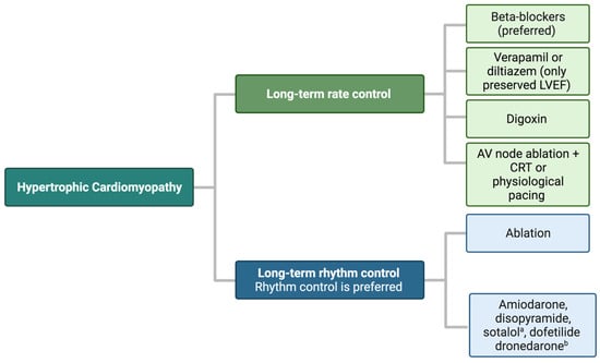 In asymptomatic patients and in those who cannot tolerate anti-arrhythmic drugs due to their adverse effects, rate control should be preferred. Recommended drugs for rate control include oral non-dihydropyridine calcium channel blockers (CCBs such as verapamil/diltiazem) or beta-blockers (metoprolol, propranolol, atenolol, nadolol), alone or in combination [1,5]. If optimal rate control cannot be achieved, digoxin may be considered alone or in combination with beta-blockers or CCBs in the long-term management of permanent AF in patients presenting with NYHA class II–IV symptoms, provided that there is no significant LVOT obstruction since the positive inotropic effect of the drug may be detrimental. Eventually, in patients with HCM for whom adequate rate control could not be achieved and for whom ablative procedures are contraindicated (i.e., significant comorbidities or advanced age), AV node ablation and pacemaker implantation may be considered. In patients with LVEF < 50%, AV node ablation may be followed by implantation through conduction system pacing (CSP) or cardiac resynchronization therapy (CRT) [15] (Figure 2).