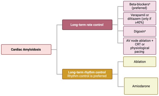 When rhythm control fails, rate control becomes essential, even if challenging. Indeed, patients with CA often have severe diastolic dysfunction with restrictive characteristics that require compensatory tachycardia in order to maintain adequate cardiac output, which account for the poor tolerance associated with the use of beta-blockers, CCB, and digoxin [47,50]. Moreover, these drugs could precipitate hypotension in the setting of concomitant autonomic dysfunction that typically occurs in CA [51] and could aggravate or generate cardiac conduction defects [52,53,54]. Guidelines and consensus documents [28,45] recommend a low dose of beta-blockers as first-line treatment in the setting of a rate control strategy in CA. Digoxin can be used with caution as a second-line treatment, while verapamil or diltiazem should be reserved for patients with LVEF ≥40%. In patients with CA and poor ventricular rate control despite optimal medical therapy and who are not candidates for rhythm control by catheter ablation, atrioventricular node ablation with CRT or physiological pacing is an alternative [45] (Figure 3).
