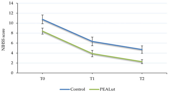 Changes in NIHSS scores were evaluated at each time point showing a significant improvement over time in both groups (p < 0.0001). Among the control patients, stroke deficit severity improved progressively throughout the observation period: the mean NIHSS score decreased from 10.8 ± 0.88 at T0 to 6.3 ± 0.87 at T1 and 4.7 ± 0.74 at T2. Similar improvements occurred in patients who received PEALut, with a mean NIHSS score of 8.4 ± 0.61 at baseline, 3.9 ± 0.64 at T1 and 2.3 ± 0.41 at T2 (Table 2 and Figure 1).