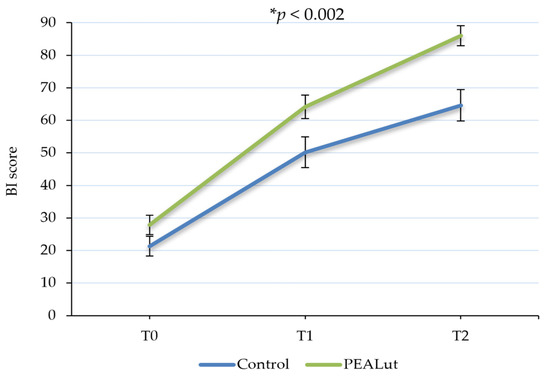 The functional independence detected using mRS showed a significant improvement over time, with a statistically significant difference between the two groups in favor of the PEALut-treated one (p < 0.0001). In the control group, the mean mRS total score decreased from 4.4 ± 0.12 at T0 to 3.3 ± 0.24 at T1 and 2.9 ± 0.29 at T2. In the PEALut-treated group, the average value of mRS at baseline was 3.9 ± 0.14, which decreased to a mean value of 3.0 ± 0.20 at T1 and a mean score of 1.3 ± 0.23 at T2. Importantly, post hoc analysis showed that at the end of the treatment, the mean BI scores of the two groups reached a statistically significant difference (p = 0.0028) (Table 4 and Figure 3).