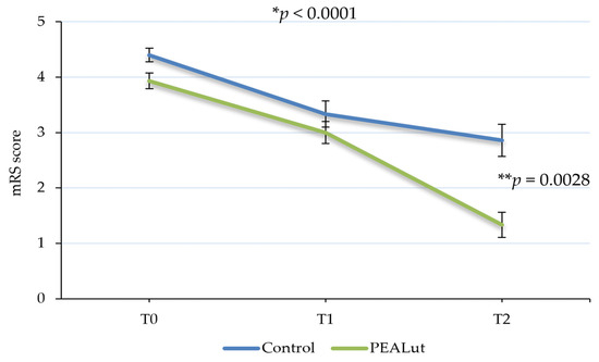 Evolution of modified Rankin Scale (mRS) score over time. Patients’ disability significantly improved over time, with a statistically significant difference between the two groups in favor of PEALut-treated patients. Values are presented as mean ± S.E. * Significant change over time (GLMM); ** significant change between the two groups (post hoc analysis).