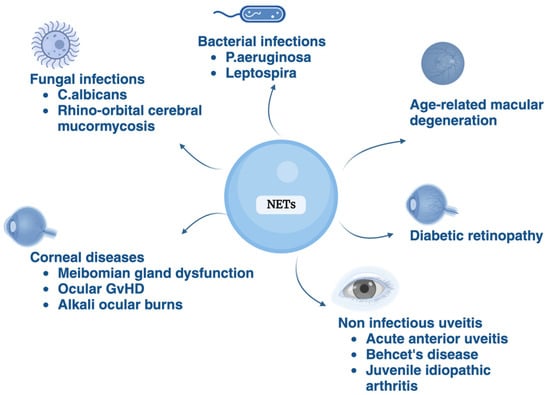 As a result, NETs have piqued the curiosity and attention of specialists from a wide range of fields. This has further expanded into the field of ophthalmology, where researchers discovered that NETs have opposing functions in the ocular system for neutrophils in normal and pathological environments. For example, NETs play a pathological role in uveitis, dry eye disease, and many other pathologies [14,15,16]. In this review, we aim to summarize the latest literature on the role of NETs in physiological and pathological conditions. Then, we describe the implications of targeting NETs in the treatment of several ocular pathologies.
