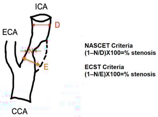 - Staikov, I.N.; Arnold, M.; Mattle, H.P.; Remonda, L.; Sturzenegger, M.; Baumgartner, R.W.; Schroth, G. Comparison of the ECST, CC, and NASCET grading methods and ultrasound for assessing carotid stenosis. European Carotid Surgery Trial. North American Symptomatic Carotid Endarterectomy Trial. J. Neurol. 2000, 9, 681–686. [Google Scholar] [CrossRef]