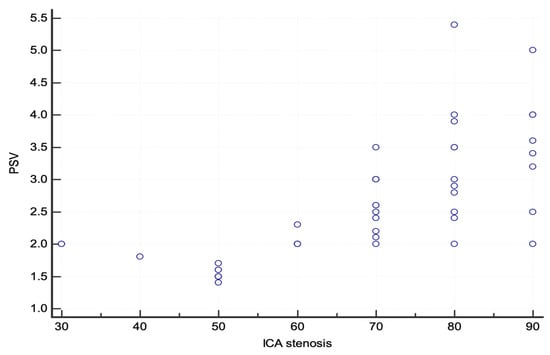 According to the NASCET criteria, three lesions were <50%, seven lesions were 50–59%, five lesions were 60–69%, and the remaining thirty lesions were ≥70%. The scatter plot of PSV and the degree of ICA stenosis is shown in Figure 2.