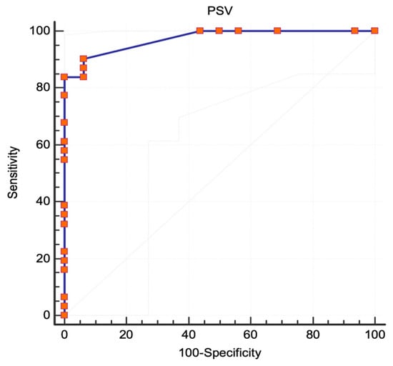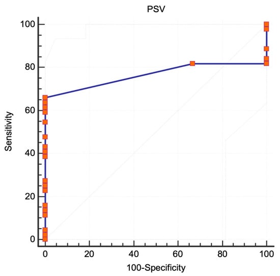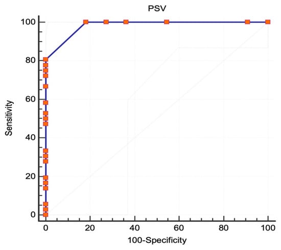 However, for ICA stenoses ≥60%, PSV was a good criterion for selection, with an excellent correlation expressed by an AUC of 0.982 (95% CI 0.893 to 1, standard error 0.0133, p < 0.0001) (Figure 4). The best-associated criterion was a PSV threshold of 180 cm/s, with a sensitivity of 100% (95% CI 90.3–100) and a specificity of 81.82% (95% CI 48.2–97.7), and the Youden index of 0.81 suggested a good performance of the test. The sensitivity and specificity of various PSV thresholds at intervals of 10 cm/s are presented in Table 1.