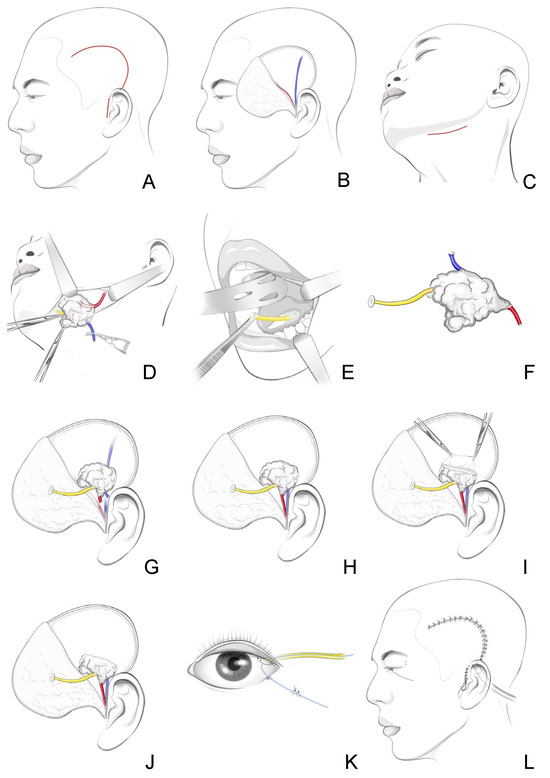Partial SMG transplantation. (A) Incision in the temporal region. (B) Preparation of the recipient bed. (C) Incision in the submandibular region. (D) Harvest of the submandibular gland. (E) Harvest of the Wharton’s duct. (F) The graft. (G) Transplantation of the graft to the recipient bed. (H) Part of the gland was removed, with the capsule preserved. (I) The graft after volume reduction. (J) Vascular anastomosis. (K) A nylon tube was inserted and left in the Wharton’s duct. (L) Closure of the incision.