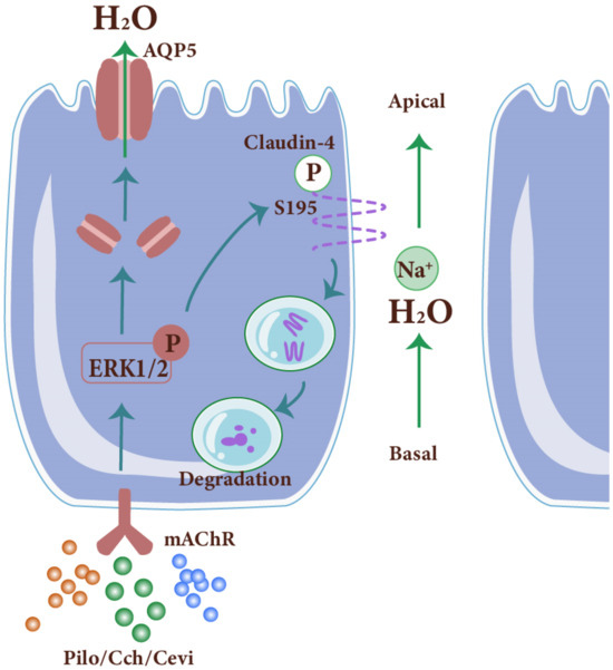 The intracellular mechanism underlying muscarinic acetylcholine receptor (mAChR) in submandibular gland acinar cells. The activation of mAChR by agonists promotes saliva secretion through the aquaporin 5 (AQP5)-mediated transcellular pathway and claudin-4-mediated paracellular pathway, both of which are accomplished in an extracellular-signal-regulated protein kinase 1/2 (ERK1/2)-dependent manner. Pilo, pilocarpine. Cch, carbachol. Cevi, cevimeline. Solid line, transcellular pathway. Dotted line, paracellular pathway.