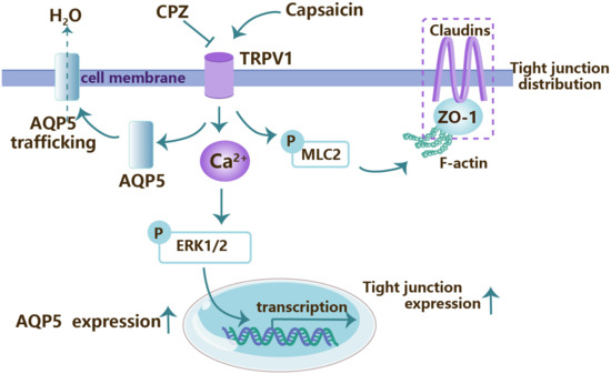 Interestingly, the expression and function of transient receptor potential vanilloid subtype 1 (TRPV1) in SMGs was first identified by Yu’s group [49]. The activation of TRPV1 upregulated AQP5 expression leads to AQP5 redistribution in a Ca2+-extracellular-signal-regulated protein kinase 1/2 (ERK1/2)-dependent pathway [50]. In addition, TRPV1 activation also modulates the expression and distribution of tight junction proteins in ERK1/2- and MLC2-dependent pathways, respectively, and herein increases the paracellular permeability across the epithelial cells (Figure 4) [51]. Furthermore, the expression of TRPV1 is downregulated in the rabbit transplanted SMGs in a short-term model, whereas the topical application of the TRPV1 agonist capsaicin gel shows a considerable therapeutic effect to promote the secretion and help the glands to overcome the latent period [50,52].