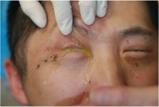 The latent period lasted for about 3 months, with little or no lubrication in the eyes. The Wharton’s duct of the transplanted SMG may be obstructed without saliva flow over a long period, leading to surgical failure [18,42]. Beyond the “stable period”, a large percentage of patients complained of too much secretion from the graft, aggravated by warmth or physical activity [28,37]. The rate of severe epiphora (Figure 2), defined as unacceptable lubrication, was 17%, 24.14%, and 60.1% in three long-term follow-up studies [17,18,30]. Severe epiphora resulted in social awkwardness and might lead to microcystic edema of the cornea [17] and even reduced visual acuity [18] and quality of life [10].