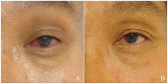 The manifestation of the ocular surface before and after operation. (A) Obvious dryness with conjunctival hyperemia before operation. (B) Moist ocular surface without conjunctival hyperemia 5 years after operation, demonstrating good long-term results of this procedure.