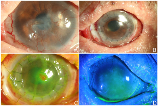Clinical photographs from a 58-year-old patient with Stevens–Johnson syndrome who underwent submandibular gland transplantation. (A) Anterior segment photograph before corneal transplantation. (B) Photograph 4 days after transplantation. (C) Infection is seen 30 days postoperatively, with small microflora (asterisk) and corneal epithelial ulceration. (D) Corneal fluorescein staining of the non-operative eye.