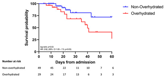 Kaplan–Meier survival curves. Time to death for the overhydrated group (blue line) vs. the non-overhydrated group (red line). Time 0 corresponded to ICU admission. Patients who were discharged alive before 60 days were treated as still at risk and not censored at discharge.