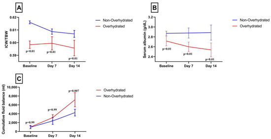 Illustration of the changes in ICW/TBW ratio (A), serum albumin (g/dL) (B) and cumulative fluid balance (mL) (C) at baseline, day 7 and day 14. The red line represents the overhydrated group and the blue line the non-overhydrated group. Data are presented as the mean and SEM. p < 0.05 for Bonferroni multiple comparison’s test, Abbreviations: ICW/TBW, ratio of intracellular water to total body water.