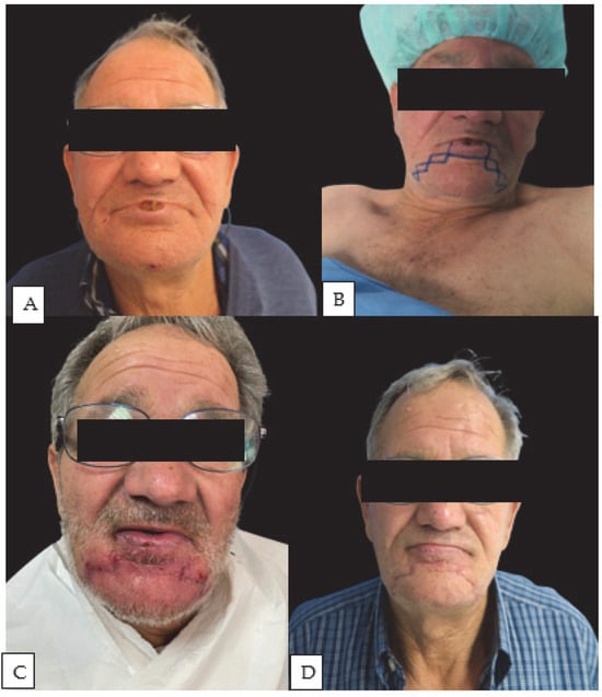- Sarici, M.; Şirinoğlu, H.; Yeşiloğlu, N.; Temiz, G. May Local Flaps Be an Alternative to Free Flaps in Total Lower Lip and Chin Reconstruction in Elderly Patients. J. Craniofacial Surg. 2016, 27, 1112–1113. [Google Scholar] [CrossRef]
