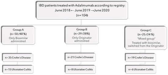 The patients were divided into three groups: Group A consisted of patients treated exclusively with the biosimilar form of adalimumab, Group B comprised patients who only received the original adalimumab, and Cohort C (referred to as the “mixed group”) included patients who initially received the reference adalimumab and switched to the biosimilar form. The decision to switch patients from the reference adalimumab to the biosimilar was made by a committee of experts at our center, which included physicians from our unit, regardless of the patients’ clinical status.