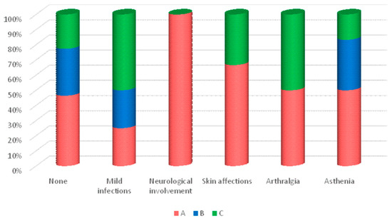 Concerning other manifestations, mild joint involvement was observed in four cases, all of which presented with arthralgias lacking a specific pattern (representing 20% of mild adverse events). Six patients, accounting for 30% of mild treatment-emergent adverse events, reported experiencing asthenia on the days of adalimumab administration. Among these six patients, four were receiving treatment with the biosimilar while the remaining two were receiving the original product. Overall, treatment Group A (exclusively treated with the biosimilar) exhibited the highest number of mild adverse reactions, totaling 11 cases. However, these differences failed to achieve statistical significance (p = 0.054).