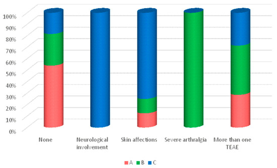 Group A had a notable percentage of treatment-emergent adverse events (TEAEs), but these were primarily mild and had minimal impact on the overall condition of the patients, thus not necessitating the frequent discontinuation of medication. In contrast, the other groups (B and C) experienced higher incidences of severe adverse effects when considering the total number of adverse events. This factor contributed to the higher persistence observed in Group A compared with the other two groups.