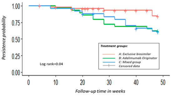 A Kaplan–Meier curve is utilized to demonstrate the persistence function of adalimumab among various treatment groups.